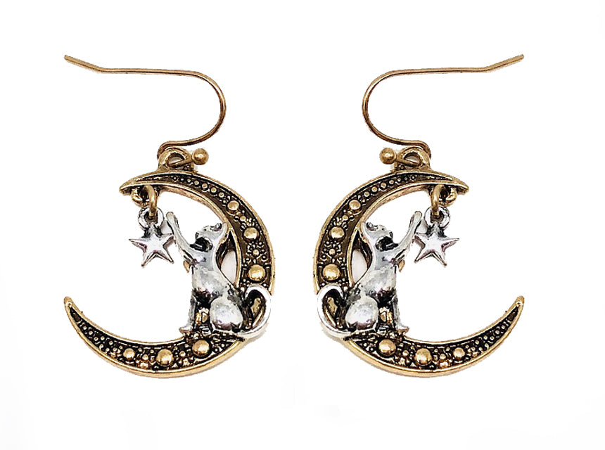 Cat w/ Moon/Star Earrings - Gold
